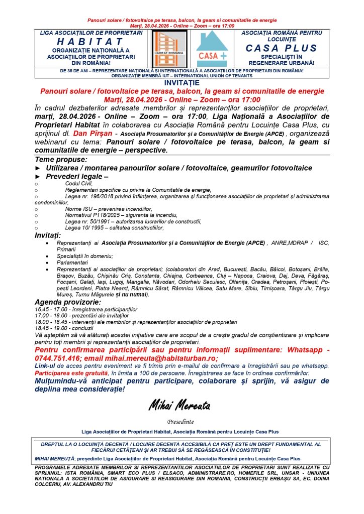 Marți, 17 martie, 10.00 – 11.00, la Radio România Antena Satelor, emisiunea Vrem să știi, redactor Claudia Ruse, o oră dedicată membrilor și reprezentanților asociațiilor de proprietari.