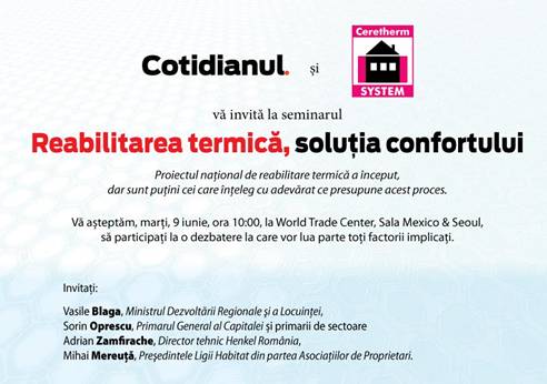 vineri, iunie 5, 2009 22:01Marti, 9 iunie, ora 10.00, la World Trade Center se desfasoara seminarul „Reabilitarea termica, solutia confortului”.